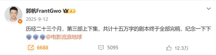 2025年9月,导演郭帆发布微博称,历经二十三个月,第三部上下集,共计十五万字的剧本终于全部完稿。