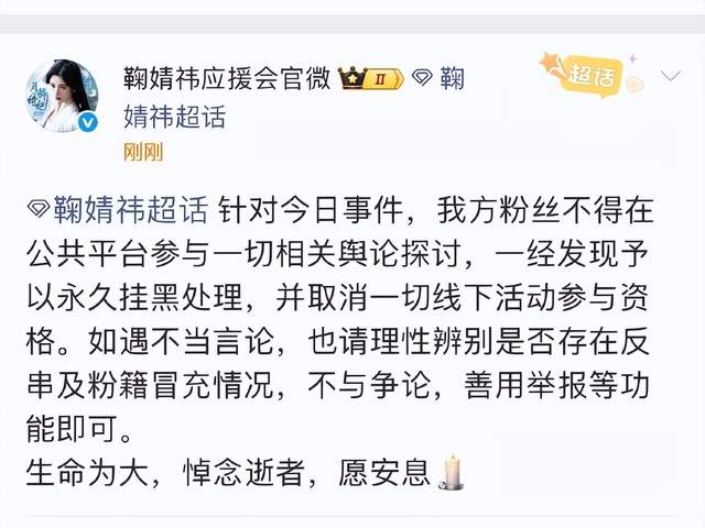 三、顶级粉丝的素养,是理性不是疯狂饭圈常被嘲"脑残"。但这一次,鞠婧祎粉丝给出了另一种答案。什么是真正的支持?不是控评刷屏,不是网暴对家。是专注艺人,是尊重生命,是理性守序。别人想带节奏?不接招。