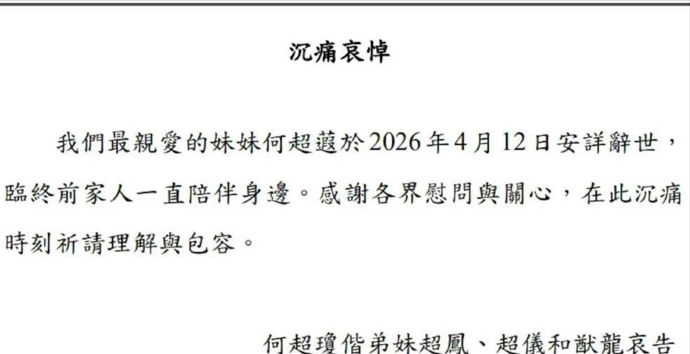 这位享年60岁的豪门千金,最终没能战胜病痛的折磨。消息传出后,何超琼、何超凤、何超仪、何猷龙四姐弟联合发布讣告,正式宣告何超蕸离世,讣告中特意提及,何超蕸临终前,家人始终陪伴在她身边,给予她最后的温暖与陪伴。