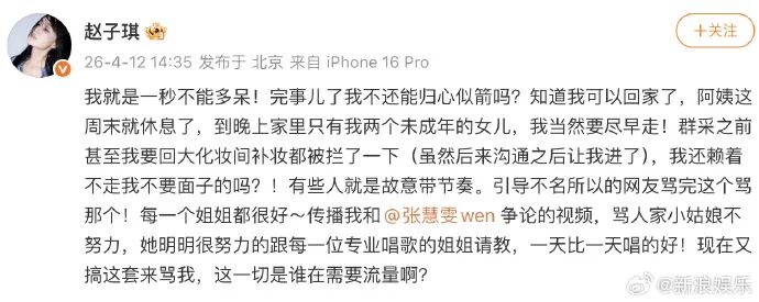 4月11日凌晨,《乘风2026》参演嘉宾,女演员赵子琪发文:“我一点都不难过!不会再来!”