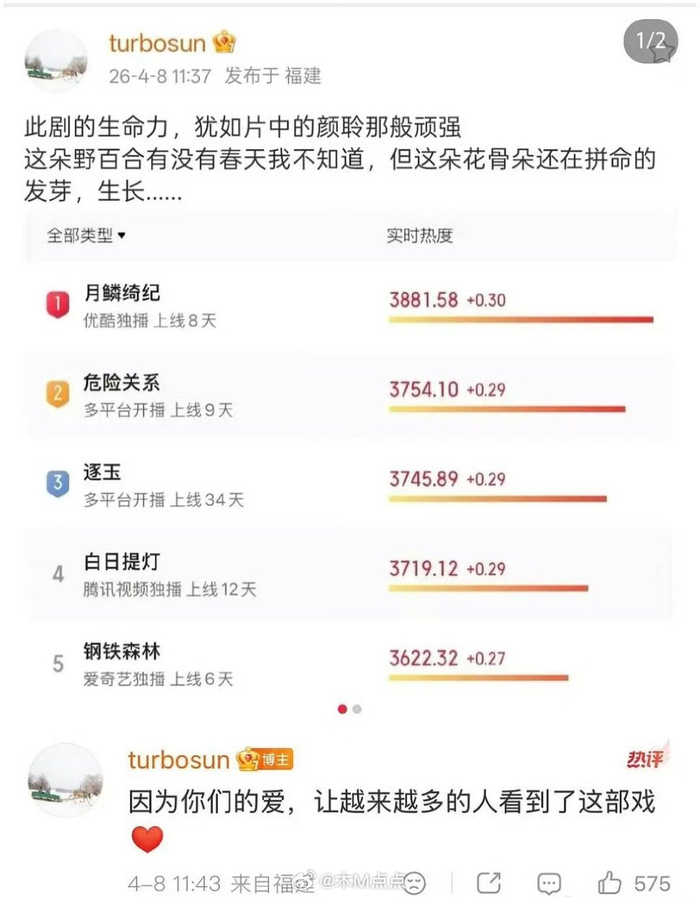 而且当时1成绩好,也确实现在也没几个剧成绩好的,尤其这种第一部成绩好的主演都换了的情况下基本都会被诟病拿来比较。也没人敢投广因为女主那事,广告商没投一定比投了强,因为会被拿出来骂😂楚乔传倒是一直涨,结果都得到了人生最差成绩