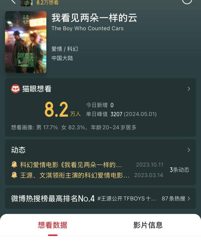 其中,科幻爱情电影《我看见两朵一样的云》由王源、文淇领衔主演,引发关注。据@电影我看见两朵一样的云 最新动态显示,影片将于“2026年相约大银幕”。