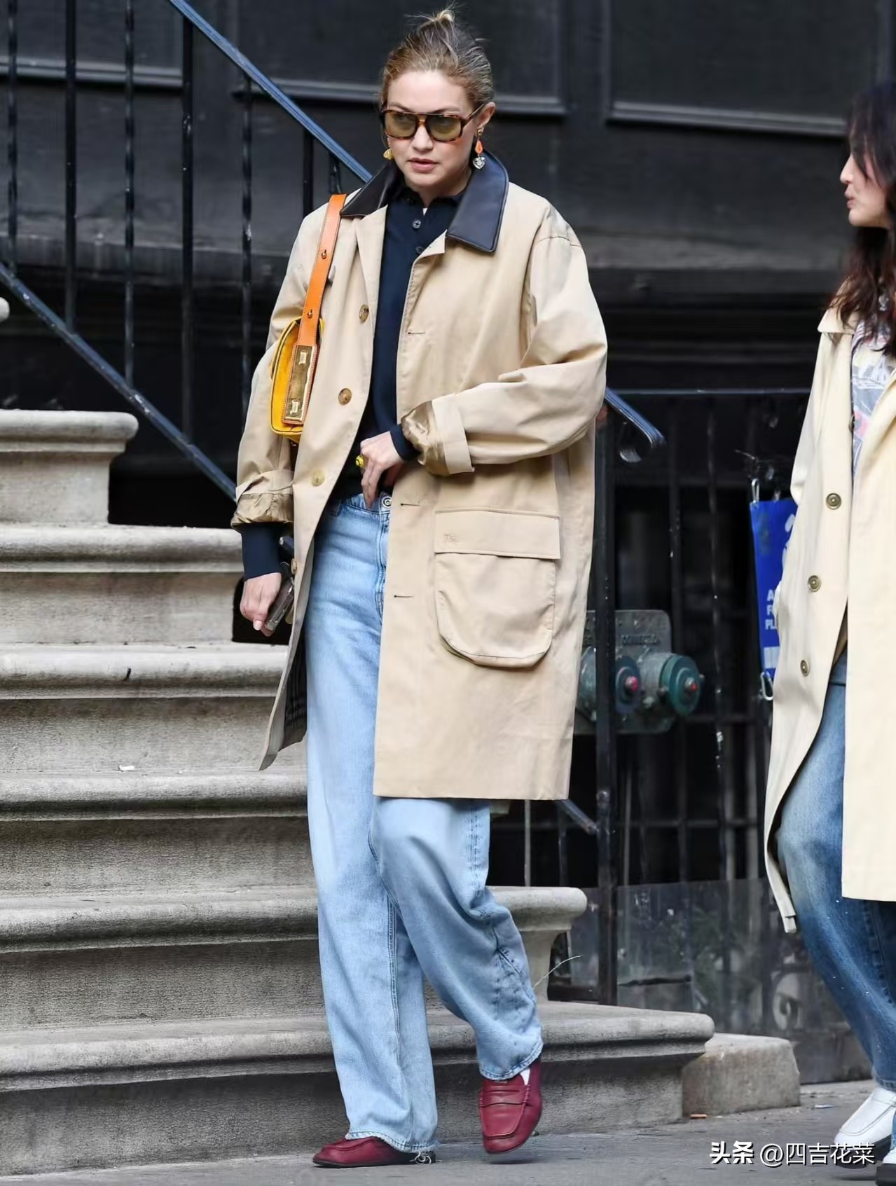 春季总离不开一件杏色的风衣,Gigi选择的是单排扣翻领的样式,比双排扣的英伦气质多一些法式风情,拼接的皮质翻领增加了一丝精致感,风衣有它粗犷的一面。