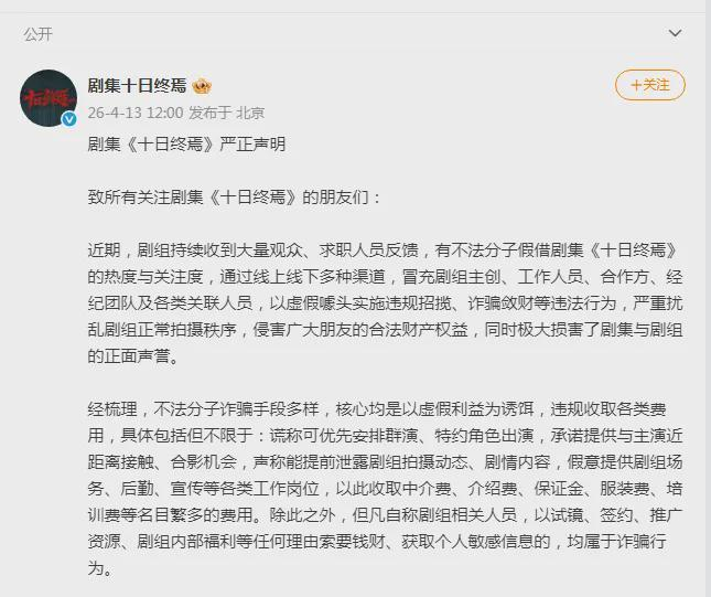 4月13日,剧集《十日终焉》发布严正声明: