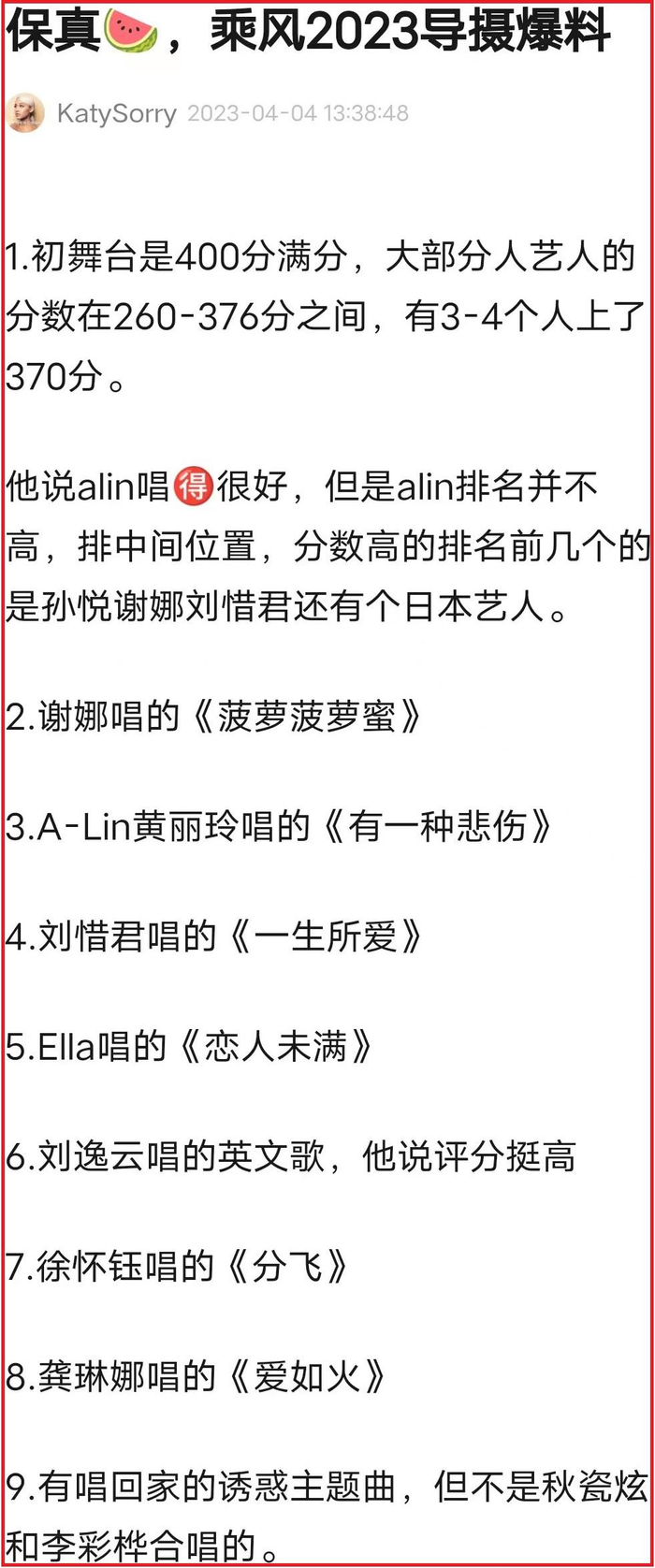 因为初始阶段没有观众,暴露的信息不多,所以评分和排名的恢复值得期待。据消息,满分400,孙悦、娜娜、萨拉、伊美莉雅可能在前四,艾拉桑《恋人未满》,娜娜桑《菠萝菠萝蜜》。