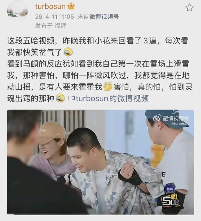 4月11号,孙俪发微博分享了自己和女儿小花的快乐日常,说母女俩正反复回看《五哈》里马頔学轮滑的片段,每看一次自己都笑到岔气。《五哈》中马頔刚学轮滑时,恐惧到不行,肢体僵硬不说,还怕得灵魂出窍,一连串地说:“不行不行不行”,大家都笑说,自从马頔加入《五哈》后,成功晋升为最有梗最好笑选手,邓超陈赫都得靠边站了。
