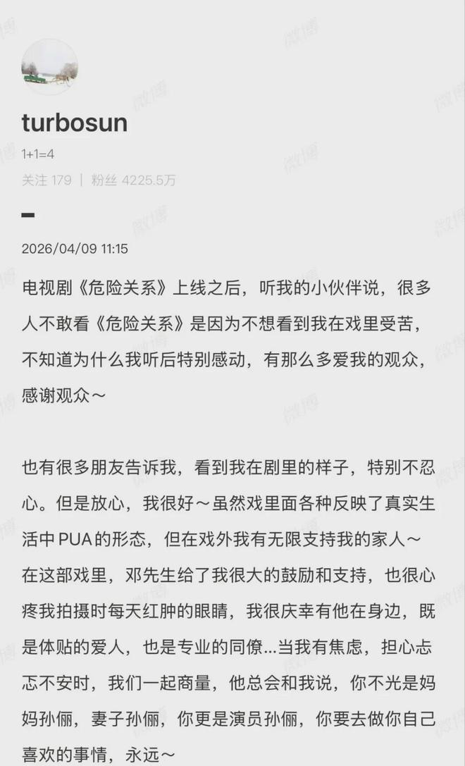 说到夫妻俩的甜蜜,就不得不提孙俪4月9号发的《危险关系》收官长文。文中她深情感谢了丈夫邓超,说他既是自己体贴的爱人,也是专业的同僚,这番话也引发了全网对两人婚姻模式的讨论,大家都夸他们是内娱夫妻天花板。