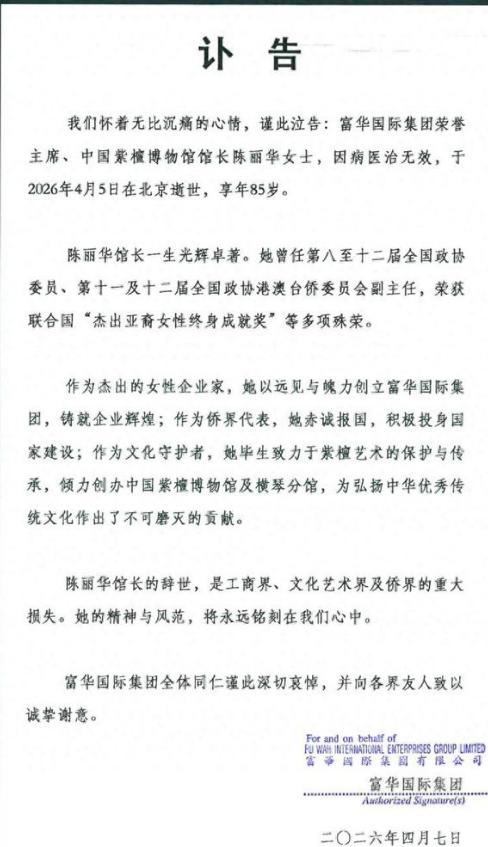 谁都没有想到,一位商界传奇的离世,最先打动人心的不是她坐拥的巨额财富,而是普通人发自内心的不舍与敬重。4月5日,85岁的陈丽华女士因病在北京逝世,这一消息经富华国际集团官宣后,瞬间牵动了无数人的心弦。四天后,她的遗体告别仪式在北京八宝山东礼堂举行,那天的北京天色阴沉,绵绵细雨淅淅沥沥,却丝毫挡不住众人送别的脚步。前来送别的人们都撑着雨伞,安静地伫立在雨中,神情肃穆,只为送这位传奇女性最后一程。