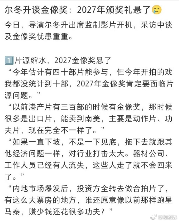 最近香港电影金像奖节目,相比以往热度高关注多,这次爆冷与之联系。爆冷一方面是指现在电影参展的数量质量大不如从前,相关人士担心未来参展作品或许更少,是否考虑要减缓评选的节奏。